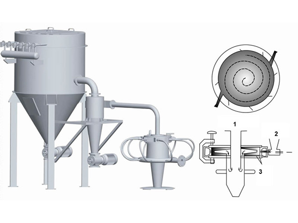 Sau khi đi vào buồng nghiền, vật liệu thô được nghiền bởi dòng khí siêu âm phun từ các lỗ phun từ ngoại vị buồng nghiền. Các phần bột va đập lẫn nhau và vỡ ra. Phần thô được tách bởi buồng phân loại và đưa lại buồng nghiền cho quá trình nghiền tiếp theo. Cuối cùng, bột siêu mịn đồng đều được lấy ở đầu ra.